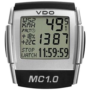This durable, versatile, water-resistant bicycle computer is an ideal onboard data tool for a wide range of cycling abilities, from cross country cycle warriors to commuters who like to track their mileage and elevation. Features Heavy duty wire Full text display in seven selectable languages Service interval indicator Auto start and stop Sleep mode (display shut-down) Stopwatch indicator Adjustable home altitude Recalibration of home altitude Actual altitude correction mode Programmable odometer Twist-Click mounting Bicycle Functions Actual speed Trip counter Odometer WS 1, WS2, and total Ride timer Clock Average speed Maximum speed Stopwatch Comparison of actual speed and average speed NAVIGATOR second programmable trip counter Two wheel sizes Altimeter Functions Actual altitude, gradient, and temperature Altitude gain on actual trip Maximum altitude reached on trip Average and maximum gradient on trip Total altitude gain on all trips Maximum altitude reached on all trips Warranty This VDO bicycle computer includes a limited five-year warranty against defects in manufacturing and workmanship. About VDO VDO, founded in 1929, is a diversified company specializing in high-performance electronic equipment for land and marine vehicles. Its product portfolio includes: Bicycle computers Car navigation and multimedia Sophisticated car audio systems Telematics solutions for private and public vehicle fleets Industrial and marine products for original equipment manufacturers Vehicle spares and spare part service for end-of-production vehicles For the cyclist that likes to track climbing feet even if it's small rolling hills, it still adds up. Cycling functions include: current/average/max speed, ride time (total bike 1/bike 2/bike 1+2),Trip (total bike 1/ bike 2/ bike), 2nd programmable trip distance and stopwatch. Altimeter functions include: Current, maximum and average altitude and gradient. Current temperature, maximum altitude, total feet climbed (total bikes 1/bike 2/ bike). Also, home altitude is adjustable with a quick recalibration feature. Additional features include auto start / stop, a service interval indicator (programmable), 5 Year warranty.