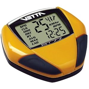 Vetta's RT77 Cadence model is a true training partner for cycling enthusiasts and competitors. In addition to all the other RT Series functions - total of 9 in all - the RT77 features Freeze Frame Memory and 3 Cadence readings: Current, Average and Maximum Cadence. The Maximum Cadence function is especially useful to sprinters in determining leg speed and rpms in relationship to building power and endurance. Current Speed. Average Speed. Maximum Speed. Speed Comparator. Cumulative Odometer. Trip Odometer. 12 / 24 Hour Clock. Ride Timer. Service Timer. Cadence. Average Cadence. Maximum Cadence. Freeze Frame Memory. Dual Display. Auto Start Stop.